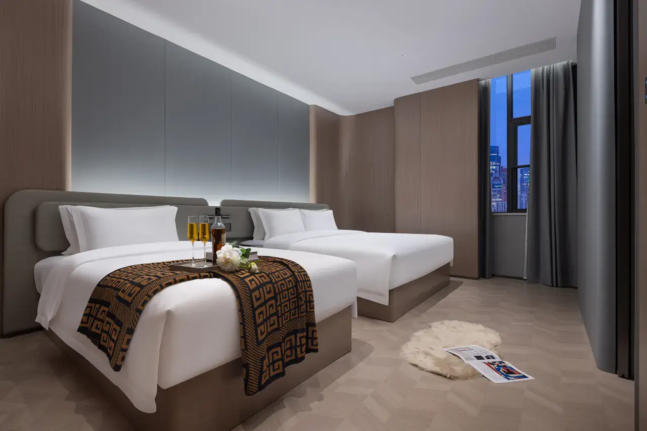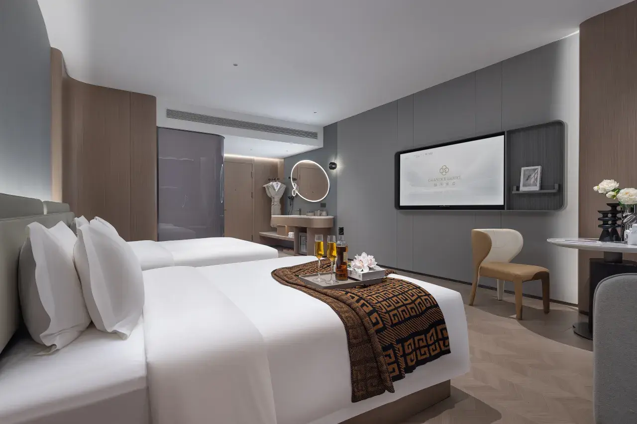 Designed for modern professionals and families alike, the Grey Business Twin room at the Grandee Hotel (Guangzhou Panyu Chimelong Safari Park Branch) offers a sophisticated and spacious retreat. Located at No. 463 Fushi Road, Panyu District, this room type provides a generous 30–40㎡ of living space on floors 4–6, ensuring a quiet and comfortable stay near Guangzhou’s top attractions.
